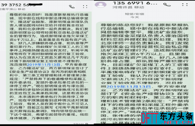 26日,在得知平煤集团准备对平禹新明煤业的复工复产进行验收。于是撰稿人给平煤集团负责小煤矿管理的张浩先生和平禹煤电公司程洪涛总经理发送了以下短信。但没有得到任何回应。