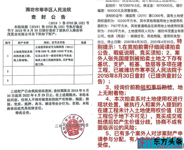 奎文区法院于2020年7月7日启动案涉土地拍卖,并发布拍卖公告。公告特别提示中载明”案外人张先国提到案涉土地之下存在基坑、支护、桩基垫层等多项在建工程,已被潍坊市寒亭区人民法院于2018年8月30日查封(已提供查封公告)。”并注明“本次拍卖系对土地单独拍卖土地使用权进行现状处置,被执行人和案外人提到的在建工程未记入土地使用权价值(因工程位于地下不可见),竞卖成功如产生价值分歧,协商不成有面临诉讼的风险"。未将地下工程纳入评估处置范围。