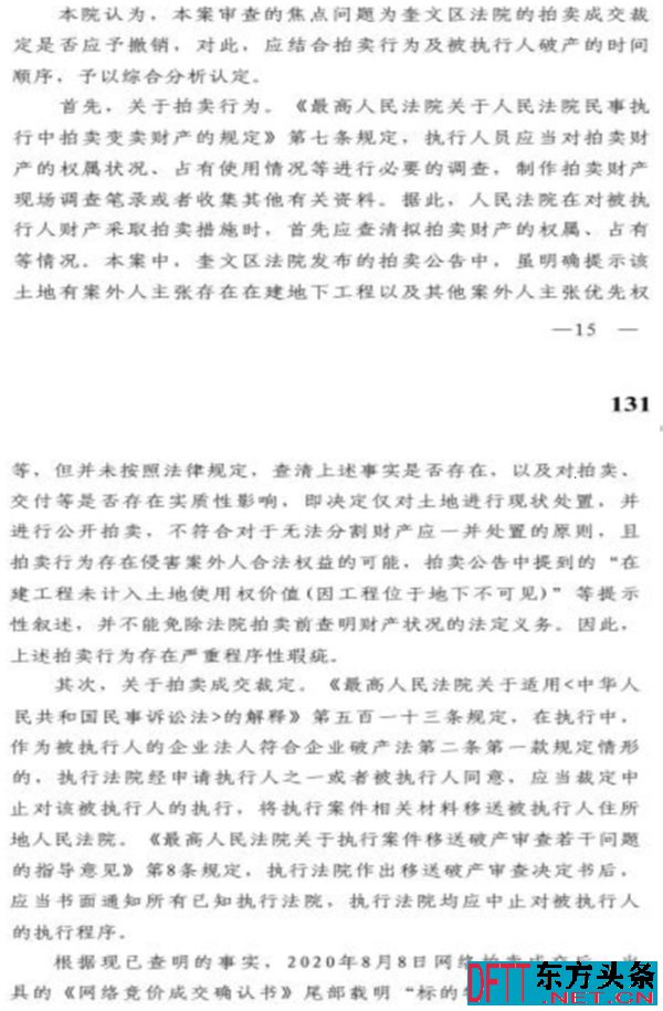 张先国认为:奎文法院的执行行为存在双重违法:一是单独拍卖土地导致“房地分离”,违反《民法典》第三百五十六条强制性规定:“建设用地使用权转让、互换、出资或者赠与的,附着于该土地上的建筑物、构筑物及其附属设施一并处分"该。该原则要求土地使用权与建筑物应当一并处分;二是奎文法院违反“执转破”程序规定。收到“执转破通知”后应当中止执行而未中止,违背《企业破产法》第十九条及相关司法解释。该行为不仅在程序上违法,更导致本应纳入破产财产的资产被非法处置。