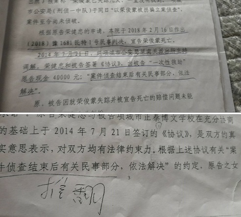 也许读者看了这纸判决书好像合乎法理逻辑,可业界人士却嗤之以鼻:“公安机关一直侦查中是法院的说辞,既然宣告荣俊蒙死亡就该启动民事责任划分了,案件很明显,刑事是刑事,民事是民事,这案件不是刑事附带民事,最终结果是一样的”。
