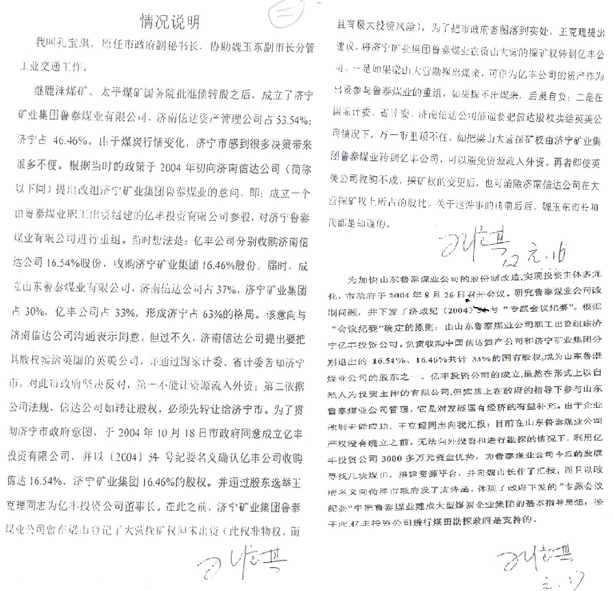 2007年底,国家纪委、煤矿安全总局发布了煤炭企业领导干部不准投资入股煤矿问题的通知,根据通知精神,亿丰公司于2007年4月18日召开股东会议,会议通过了《关于王克理等五人退出公司股权的议案》,退出的股份由市国有承接;股权退出后,亿丰公司的股东由原28名调整为22名,市属国有资本成为该公司的第一大股东之后,亿丰公司纳入鲁泰公司整体管理,所拥有的煤炭资源作为鲁泰公司以后发展的后备资源。股东会议决议后,鲁泰公司董事长王克理、党委书记乔志猛一起找到当时的济宁市国资委主任曹旭东汇报情况,让市国有收购亿丰公司的股权,曹旭东说请示市领导后再给答复。